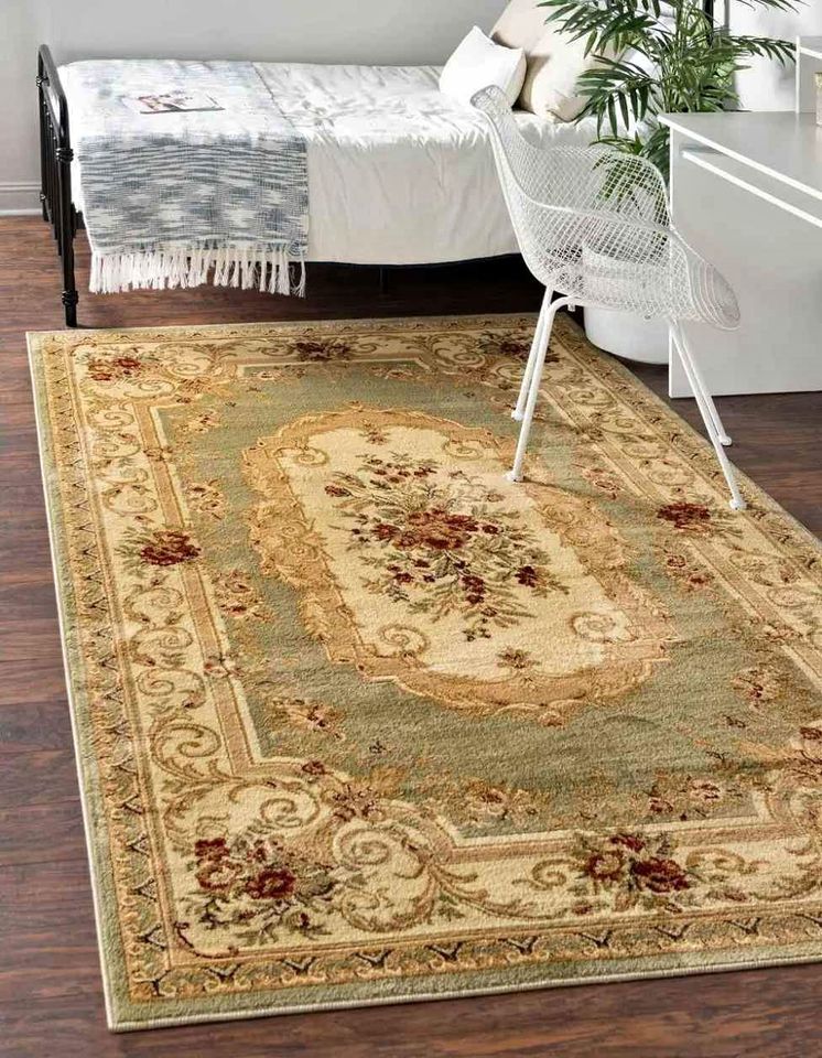 Classic Aubusson RugGreen Tan Rust Area Rug, a versatile addition to elevate your space. This rug, expertly machine-made in Turkey from high-quality 100-percent Polypropylene, boasts a low pile design, making it suitable for various spaces.